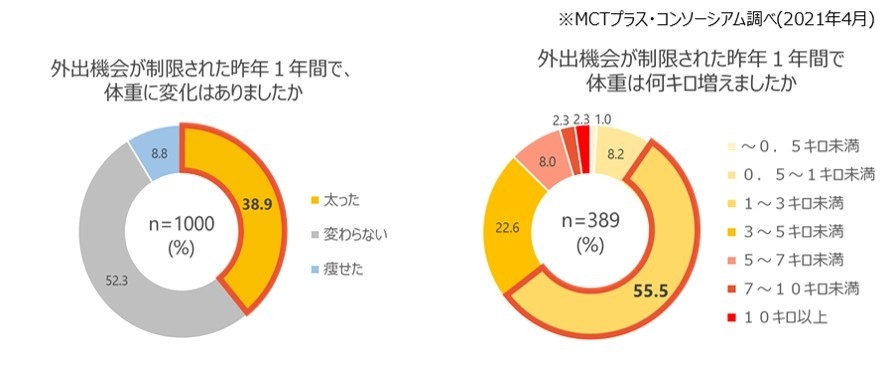 今年、首都圏に住む30歳から59歳までの男女1,000人を対象にMCTプラス・コンソーシアムがおこなった調査では、「外出機会が制限された昨年1年間で、体重が増えた」という人が約4割と分かりました。さらに、具体的にどれくらい体重が増えたのかを尋ねると、「1~3kg増」という回答が55.5%と過半数以上を占める結果となりました。