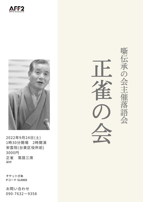 噺伝承の会主催、『正雀の会 9月』が2022年9月24日 (土)に宋雲院(東京都台東区東上野4丁目1-12)にて開催されます。