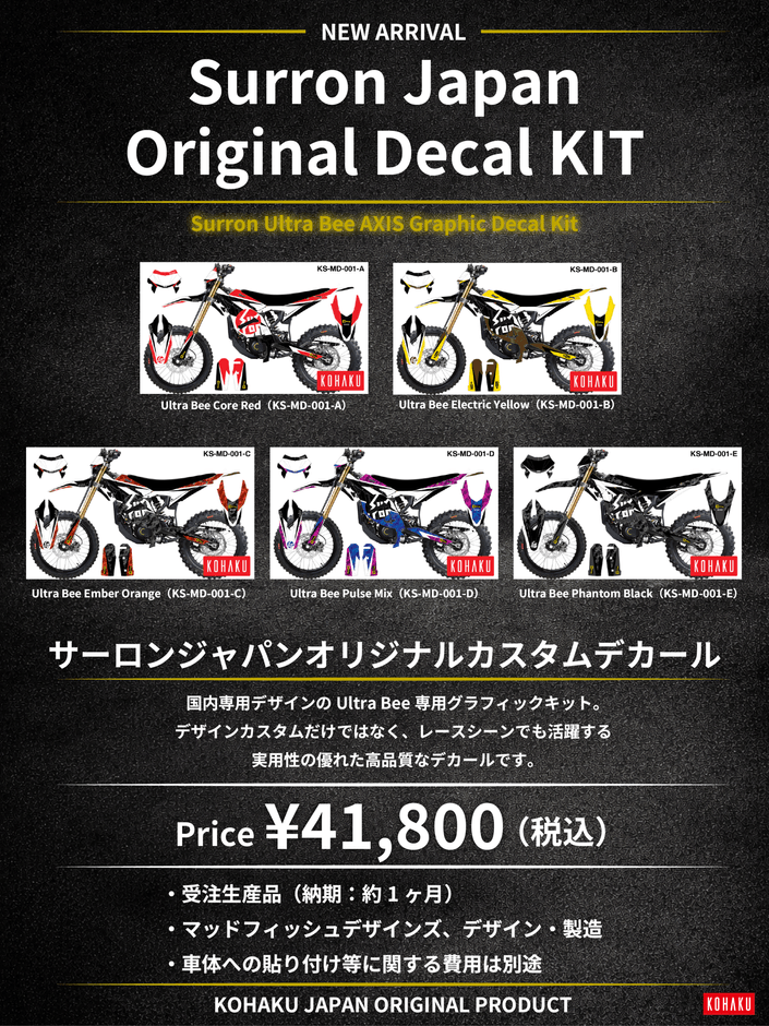 2026年4月- サーロンジャパン(輸入元:株式会社コハクジャパン/東京都葛飾区)は、電動オフロードバイク「Surron Ultra Bee」専用の日本限定カスタムデカールの受注販売を開始いたします。
