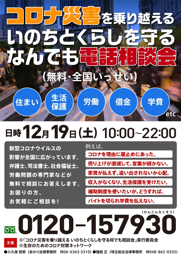 コロナ災害を乗り越える いのちとくらしを守る なんでも電話相談会実行委員会では、2020年12月19日(土)に新型コロナウイルス感染症の影響による生活困窮者向けに、住まい・生活保護・労働・借金などに関する無料電話相談会【第5弾】を開催いたします。