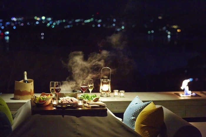 標高約900mの丘に広がる星のや富士は、全室が眼前に迫るような富士山ビュー。晴天率が高く湿気が低い冬は、一日を通して美しい富士山が見えやすい季節です。富士山に雪が積もると、月が明るい夜には雪に月光が反射し、星空に浮かび上がる雄大な姿を眺めることができます。冬の夜ならではの絶景とともに鍋を味わいます。