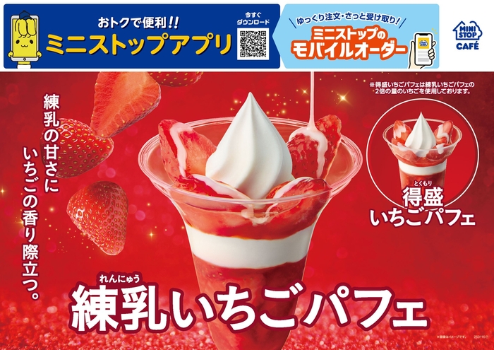 ミニストップは、ご好評をいただいているフルーツパフェの新商品として、練乳の甘さにいちごの香り際立つ「練乳いちごパフェ」と、練乳いちごパフェの2倍の量のいちごを使った「得盛いちごパフェ」の2品を、2024年11月22日(金)より、国内のミニストップの店舗にて順次発売します。
