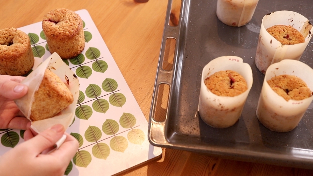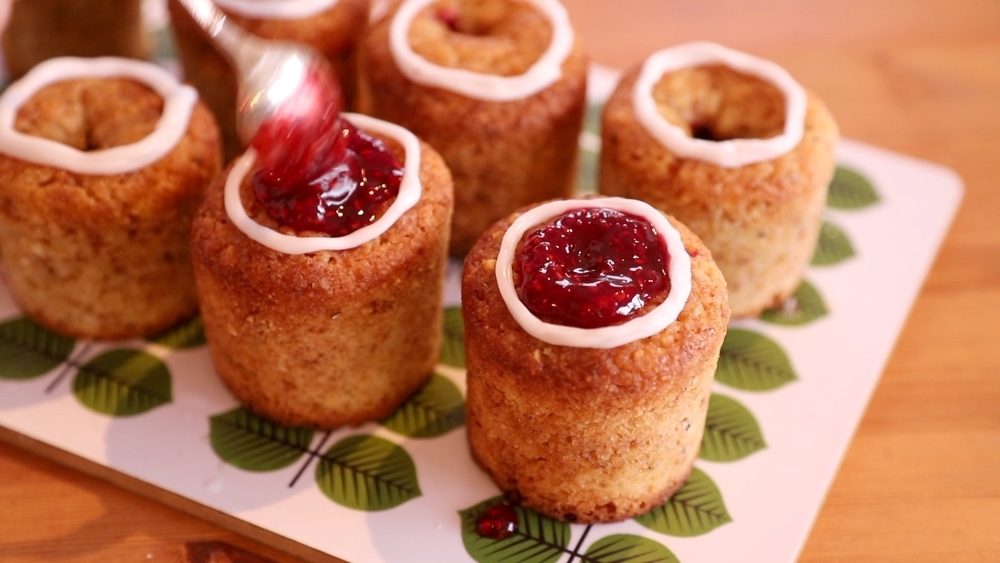 ジンジャークッキーを加えた生地は、焼き上がりにシロップを塗ることで、しっとり香り高く、重厚感のある焼き菓子に仕上がります。また上部だけでなく筒状の内部にも入れるラズベリージャムのほどよい甘酸っぱさが生地とマッチし、奥行きのある味わいを生み出しています。