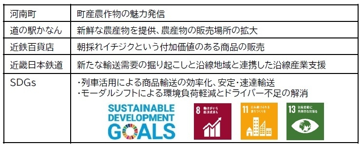 本取組みにより、河南町は町産特産品を広くアピールすることができ、近鉄および近鉄百貨店は近鉄沿線地域の特産品を通じて地域の魅力を発信できると考えております。