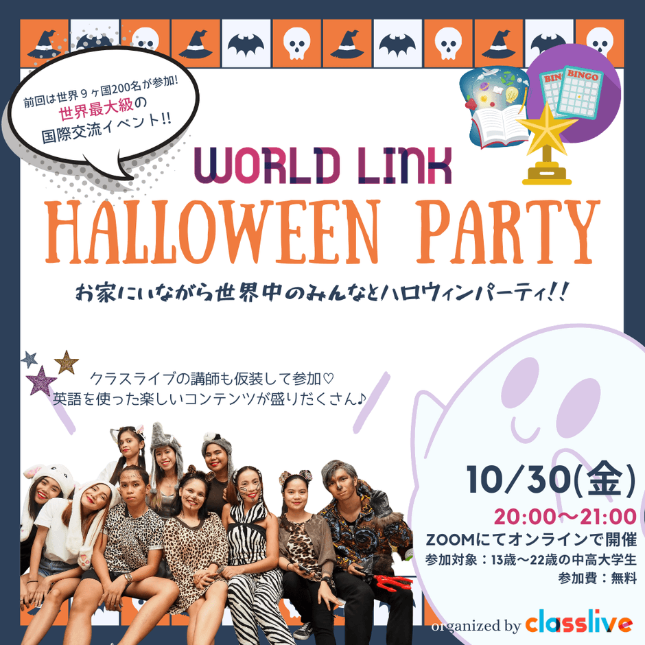 株式会社ジージー(所在地:大阪北区・東京渋谷区、代表取締役:平田 利行)は、リモート留学クラスライブが10月30日(金)20時から、家の中で仮装をして英語に触れながらハロウィンを楽しんでいただける『World Link Halloween party(ワールドリンク ハロウィンパーティー)』を開催することをお知らせします。参加対象は、世界中の13歳~22歳の中高大生です。