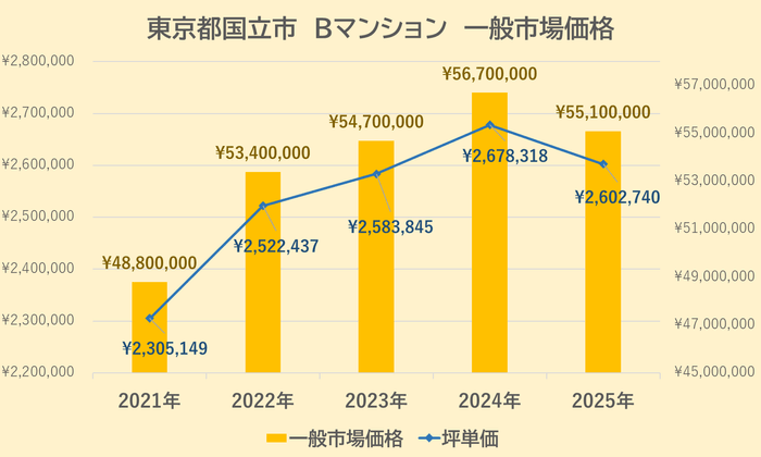 Bマンションの一般市場価格・坪単価の推移は上記【図4】の通りです。
