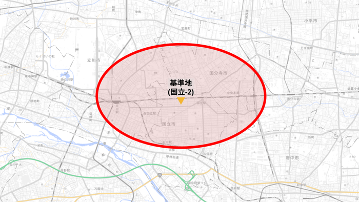 今回は、基準地(国立-2)周辺の下記エリア内のマンション事例①(築10年~19年)、マンション事例②(築20年~29年)、マンション事例③(築30年~45年)を対象に、過去5年の一般市場価格を抽出します。