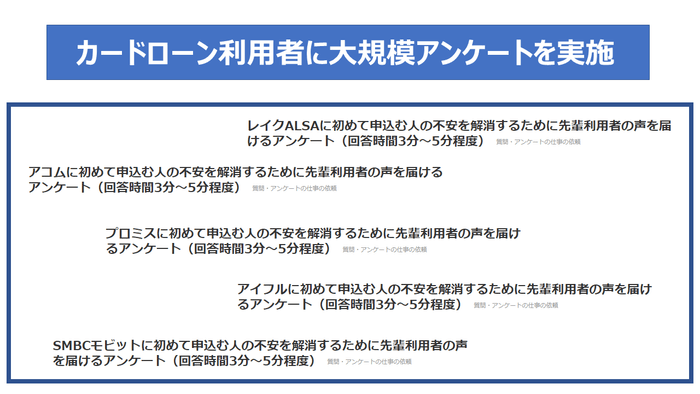 今回実施したアンケート調査のほか、消費者金融などに取材を行ったり、編集部自らがカードローンに申込んだ経験を綴ったり、お金の専門家であるファイナンシャルプランナーの方に記事の執筆・監修をいただいたりと、みなさんが安心して金融商品を利用いただけるためのメディア運営を続けてきました。