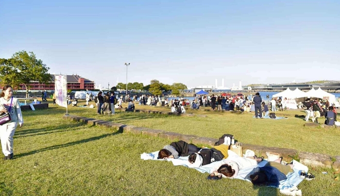 広々とした象の鼻パークでは、芝生に寝転びながら音楽を楽しむもよし、出店ブースで買った