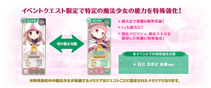 対象の魔法少女を編成して本イベントクエストをプレイする際に、ステータスを特殊な状態に強化することができます。