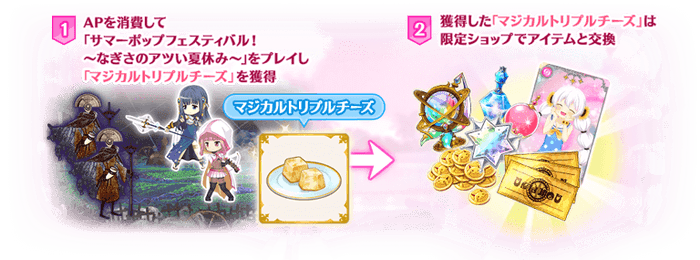 APを消費し、本イベントのクエストをプレイすることで、イベント限定ショップで限定メモリアや限定ホーム背景、ガチャチケット等のアイテムと交換できる「マジカルトリプルチーズ」を獲得できます。
