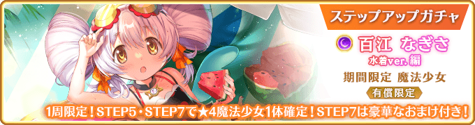 ・同時開催の『有償限定 ステップアップガチャ 百江なぎさ 水着ver.編』での★4魔法少女1体確定までのカウントは、『期間限定 百江なぎさ 水着ver. ピックアップガチャ』には引き継がれません。