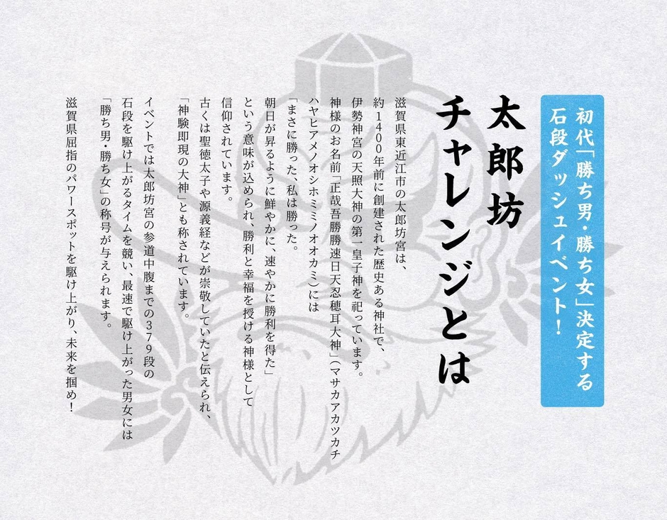 滋賀のパワースポットで日本初 初代「勝ち男・勝ち女」決定戦! 開催決定!「太郎坊チャレンジ2024」