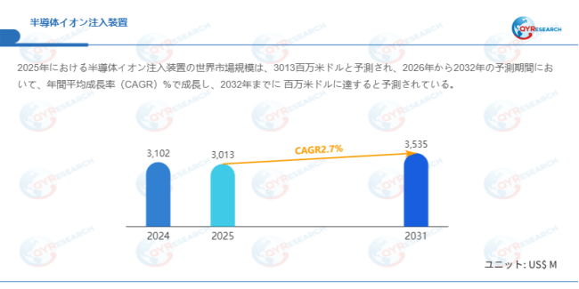 QYResearchが発表した新たな市場調査レポート「半導体イオン注入装置―グローバル市場シェアとランキング、全体の売上と需要予測、2026~2032」によると、世界の半導体イオン注入装置市場規模は2024年の約3102百万米ドルから2025年の3013百万米ドルへと順調に拡大すると見込まれ、予測期間中は年平均成長率(CAGR)2.7%で成長し、2031年には3535百万米ドルに達すると予測されている。