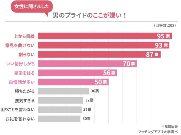 多くの女性がネガティブな印象を持つ男のプライドについて、具体的にどんなところが嫌か聞いてみました。1位は「上から目線」で208人中95票を獲得。2位の「意見を曲げない」が93票、3位「謝らない」も87票とトップ3が僅差で並びました(複数回答)。