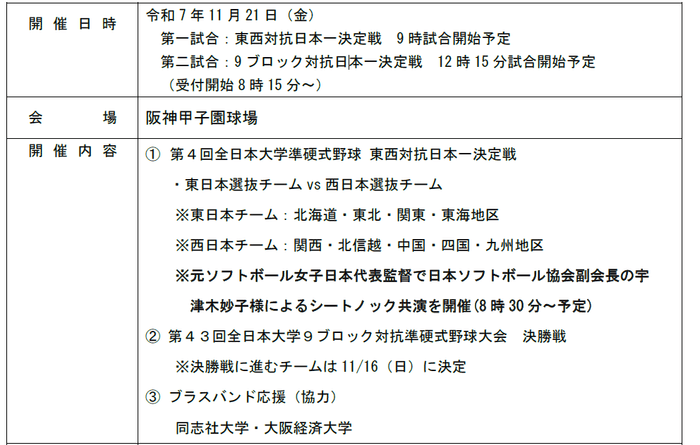 スポーツニッポン新聞社は11月21日(金)に阪神甲子園球場で開催される「第4回全日本大学準硬式野球東西対抗日本一決定戦甲子園大会」を後援します。この大会は全国270大学で約1万人がプレーする準硬式野球の最高峰の大会で、競技成績だけでなく、学業成績なども加味されて選ばれた東日本、西日本の選抜チームメンバーが真剣勝負を行う、今年で4回目を迎えた名物大会です。