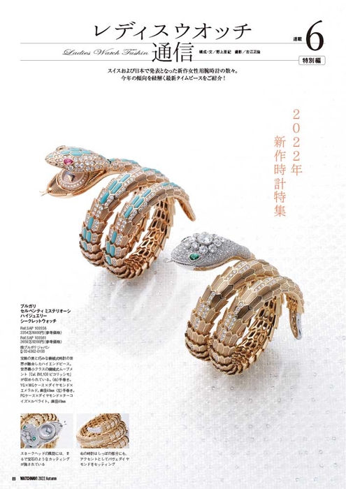 連載「レディスウオッチ通信」今号は5P特集で最新ウオッチをトレンド別に掲載。思わず溜め息が漏れるブルガリのハイジュエリーから始まる、色鮮やかな人気ブランドのタイムピースは必見です。「未来に繋げるためのACTION」では、時計業界が取り組んでいる持続可能な社会の実現に向けて取り組む代表各社の事例を取り上げました。ベテラン修理技術者や時計専門学校の実態がわかる連載記事と合わせ、腕時計への興味から広がる幅広い世界をお楽しみください。