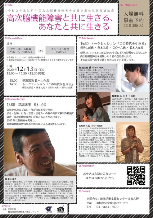 特定非営利活動法人東京ソテリアは、江戸川区高次脳機能障害普及啓発講演会「高次脳機能障害と共に生きる、あなたと主に生きる」を12月13日(日)東京江戸川区船堀・オンライン同時開催致しました。当日は全国から400名を超える参加がありました。基調講演では高次脳機能障害の基本知識からコミュニケーションの工夫が語られました。障害を経験した俳優、アーティストらをまじえたトークセッションでは、新型コロナウイルスの影響下でどう生きていくかをテーマに前向きな意見が飛び交い、逆境に負けない力強いメッセージが発信され、大変反響の大きいイベントとなりました。