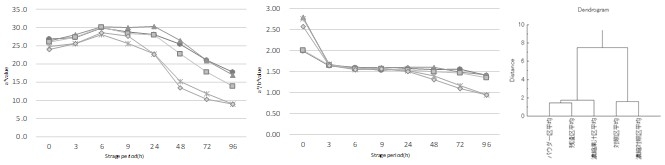 活締めし当日フィレ加工したものを真空包装し、冷蔵庫(5℃)で保管した2日後に開封したものをスライスにして、空気にさらす状態で赤身部分の色調変化を記録。色調はLab解析した。a値の経時変化(左図)とa/b値の経時変化(中央図)。パウダー区(●)(アセロラホールパウダーを餌に加えたもの)、残渣区(▲)(アセロラ搾りかすパウダーを餌に加えたもの)、対照区(*)(従来餌)、濃縮果汁区(■)(従来餌EPに濃縮果汁を外添したもの)、濃縮対照区(🔹)(従来餌EP)。右図は各系列a値のCluster分析(Ward法)結果のDendrogram。