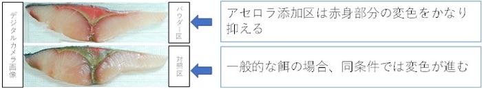別途実施した比較官能検査の結果については、上記官能検査結果と同様に「血合い筋の色調が鮮やか」で「生臭さが少ない」という評価になった。これらもアセロラの抗酸化作用の結果と推測される。