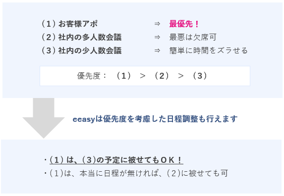 eeasyをはじめとした日程調整サービスは、カレンダーに予定が入っていない時間帯を空き日程として判定することにより日程調整を自動化しますが、裏を返せば「空き時間の中でしか日程調整できない」というサービスでもあります。しかしeeasyでは、本機能追加により日程調整サービスの根本概念を覆し、業界で初めて(*)、予定が埋まっている場合でも、優先度の低い予定に別の予定を被せて日程調整することも可能にしました。