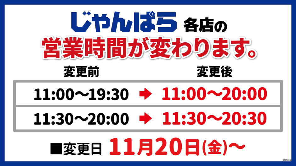 「じゃんぱら」店舗営業時間延長のお知らせ