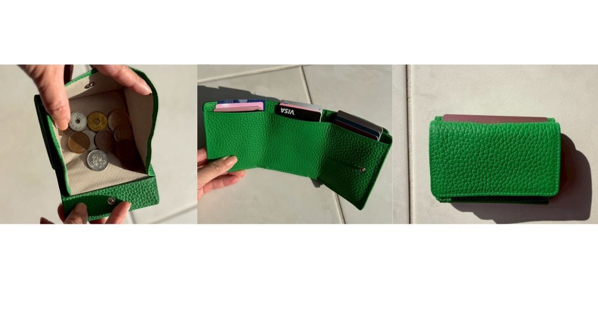 『レザー三つ折り財布』は、手のひらに収まるサイズで、コンパクトながら高い機能性を備えています。内側には4枚収納可能なカードポケットと、スナップ開閉式の小銭入れを装備。カラーバリエーションは全12色(EC限定商品も含む)を展開しており、幅広いファッションや好みに合わせてお選びいただけます。