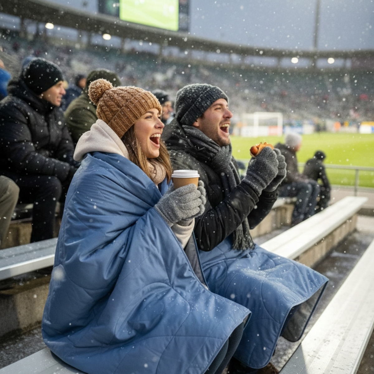 スポーツ観戦のベンチは、冬は凍えるように冷たく、Auroraブランケットは、その薄さゆえに「折りたたんで座布団(クッション)」としても使用可能。座っても断熱層が死なないため、冷たいベンチの熱を遮断しつつ、状況に応じて広げて肩掛けに。耐水・防風機能により、小雨や雪の中の観戦も苦になりません。サッカー観戦や子供試合観戦にも絶大な断熱性で、観戦に集中できます。