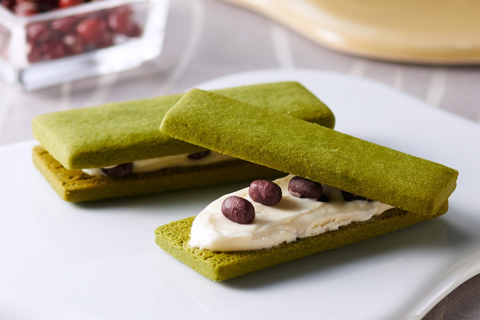 国産の米粉を使用した抹茶サブレで、ホワイトチョコレートを加えたクリームと北海道産小豆を挟んだ「宇治抹茶クリームサンド」。抹茶サブレの繊細な食感を保つため、配合と焼き加減、クリームの量とのバランスに試作を重ねました。