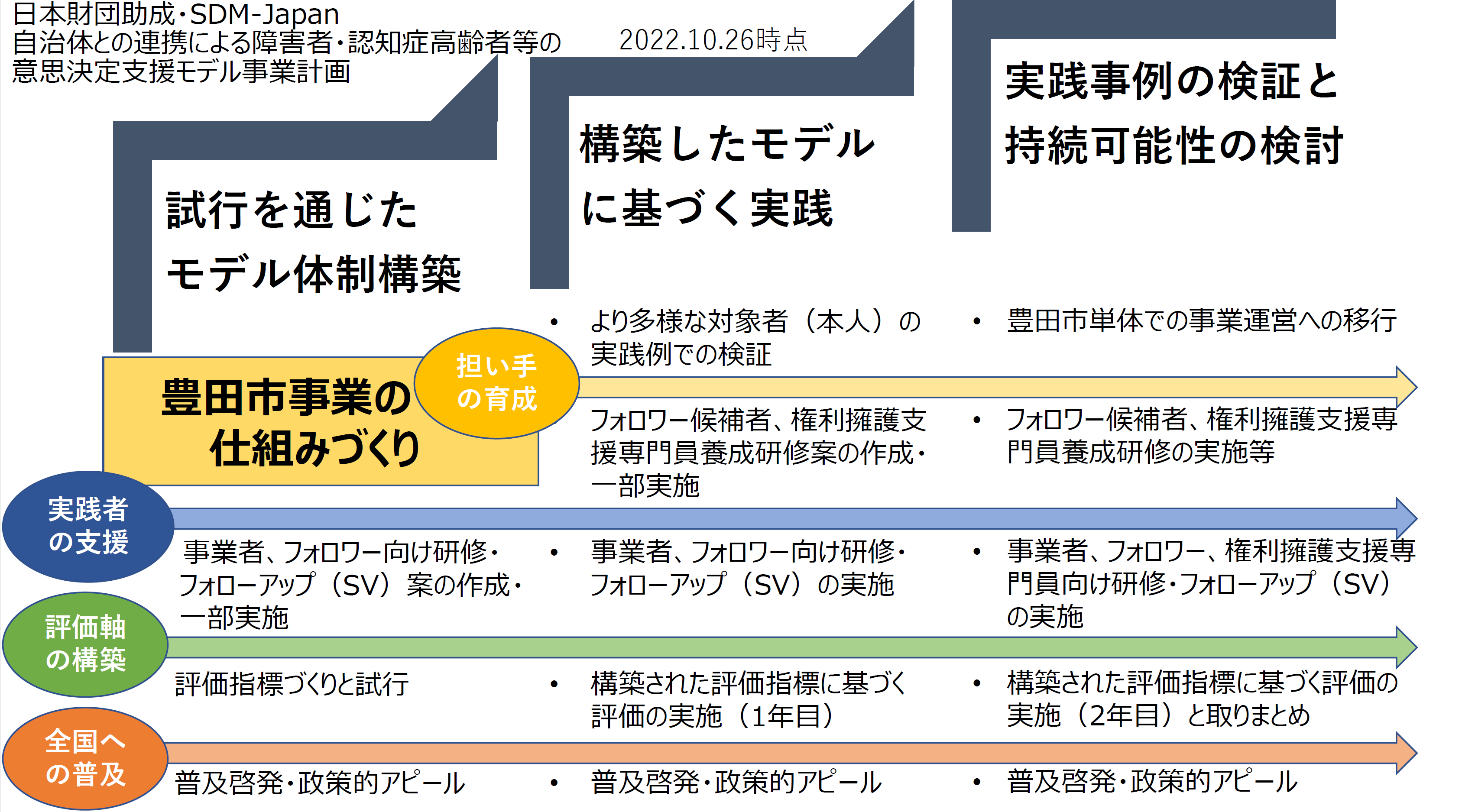 2022年度は、豊田市における支援の枠組み構築・実践の実証実験を行い、2023年度以降枠組みの効果検証・見直しや、全国での実践例を増やしていきます。SDM-Japanは、日本財団の支援を受けながら、今後も豊田市をはじめとした複数の自治体におけるモデル事業を支援し、最終的には意思決定支援に関する政策提言に繋げていく予定です。