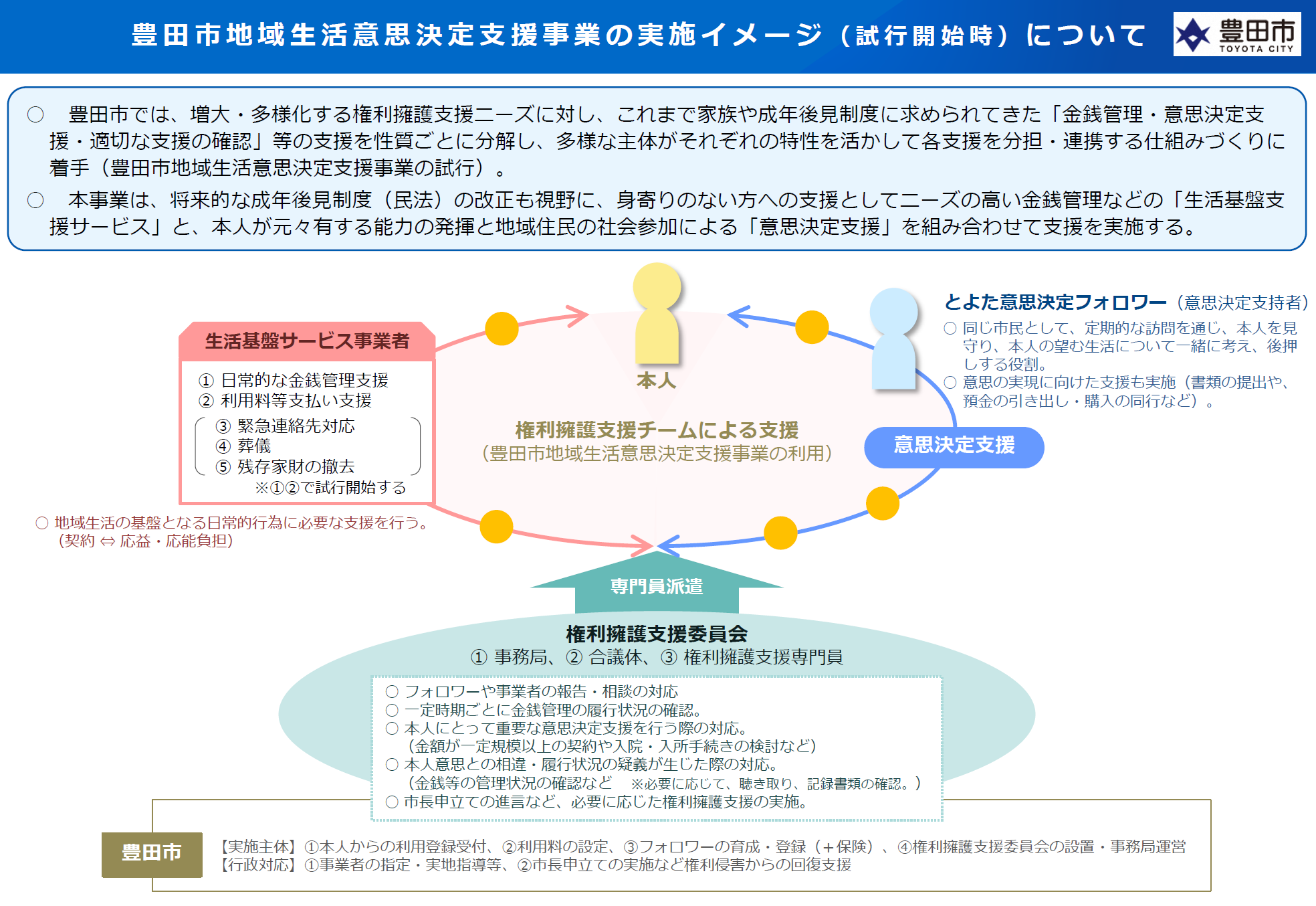 本事業は、障害者や認知症高齢者等で判断能力が十分ではないとされている人が、地域生活や社会参加を継続していくために自らの意思を形成、表明し、自分らしく生きていくための意思決定を支援する仕組みを構築・実践することを目指します。