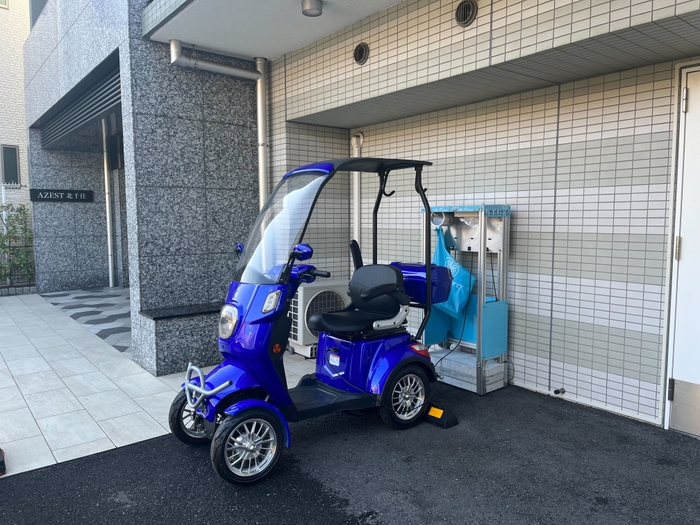 Shaeroトライクは、側車付軽二輪カテゴリの車両で、運転には普通自動車免許が必要となります。運転者も搭乗者もヘルメットが不要となる車両です。幅102cm、全長213cmとコンパクトなサイズで後部座席に2名乗車可能です。最高速度は45km/hで満充電走行距離は75km程度と、ご家族での外出や、観光地を巡るのに適した車両となっております。板橋区上板橋のマンションに設置されたステーションにて運用テストを行っており、テストが終わり次第こちらのステーションにてShaeroアプリで利用いただくことができるようになります。