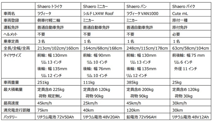 Shaeroは、3月中には「Shaeroトライク」、「Shaeroミニカー」および「Shaeroバン」の運用テストを終えて、一部のステーションにて一般ユーザーもこれらの車両の利用が可能となるように準備をしております。今後は、リゾートエリアや観光地など家族での移動が見込まれるエリアでは「Shaeroトライク」の、また温泉地などあらゆる世代の方が訪れるような観光地では「Shaeroミニカー」のステーションを設置する予定です。また、「Shaeroバン」については、一般利用者の荷物輸送ニーズがあるエリアや大型店舗へのステーション設置や、法人専用機能とセットで物流拠点への提供を検討しております。