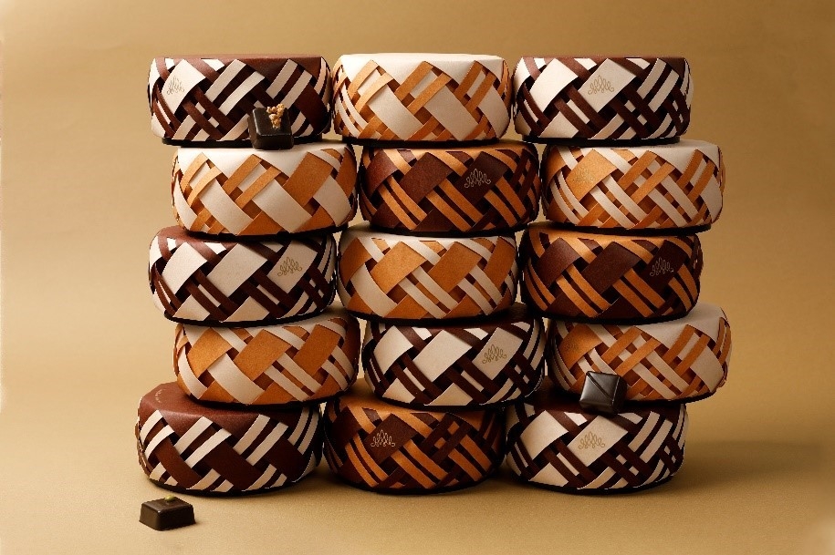 マーケットに出かけるとき、フランス人はパニエ(カゴ)を持参します。パニエに入る分だけを買うから、買いすぎず無駄がない─。このサスティナブルな知恵は、ジャン=ミッシェルのショコラづくりに通じています。また、世界各地で伝統的・日常的に行われてきた「編む」という職人的技巧へのリスペクトと、ショコラから広がる編み目のような人々とのつながりもシンボリックに表現したシリーズです。