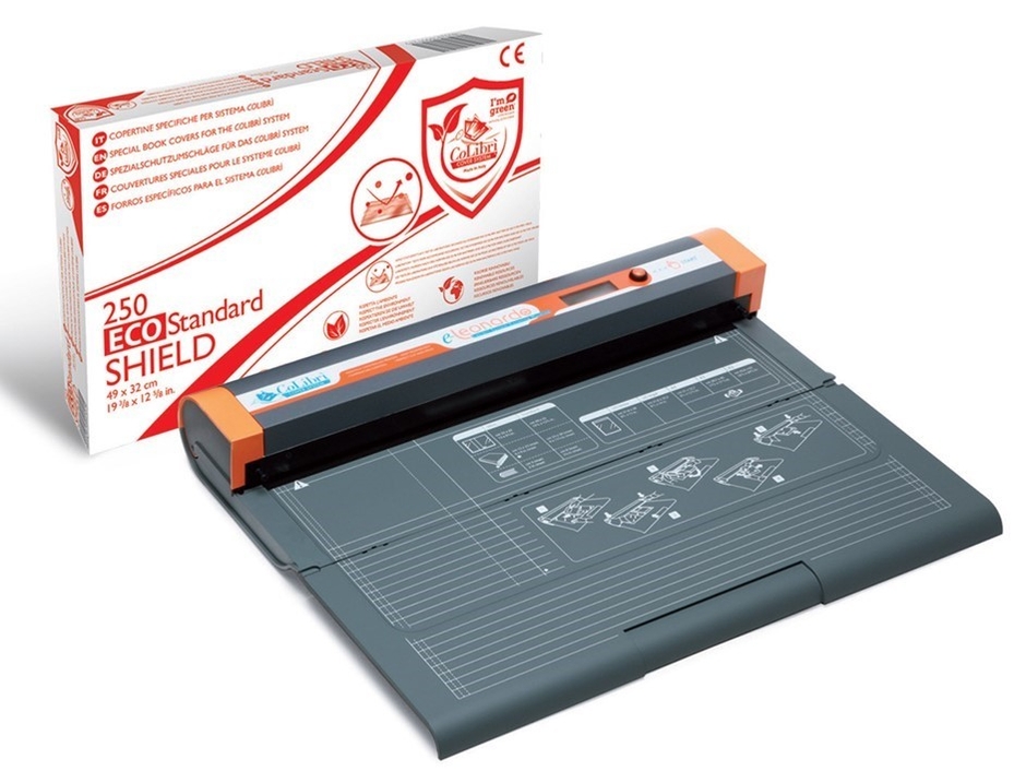 ブックカバー作成機(コリブリe-ダビンチ)を使用し、ブックカバーフィルムを熱で圧着・溶断を行い、どんなサイズの本にもピッタリサイズでブックカバーを掛けることができます。
