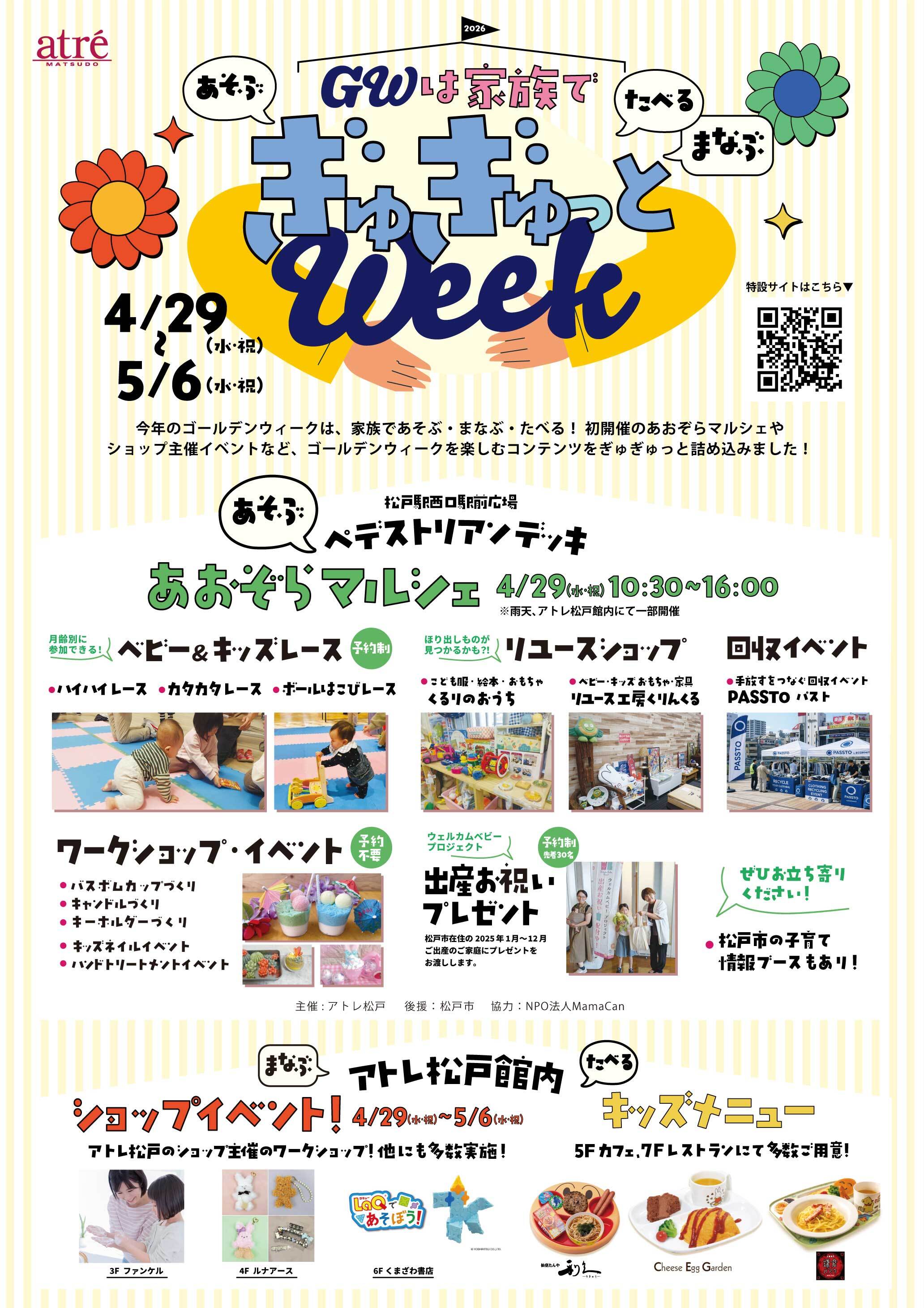 株式会社アトレ(本社:東京都渋谷区、代表取締役社長:高橋 弘行※)が運営するアトレ松戸(所在地:千葉県松戸市)は、2026年4月29日(水・祝)~5月6日(水・祝)の期間中、家族で楽しめる「ぎゅぎゅっと ウィーク」を開催いたします。本イベントでは、「あそぶ・まなぶ・たべる」をテーマに、ベビー・キッズレースや子供用品のリユース販売などを開催する「あおぞらマルシェ」や、アトレ松戸館内のショップが主催するワークショップなど、GWの思い出作りにぴったりなコンテンツをお届けします。