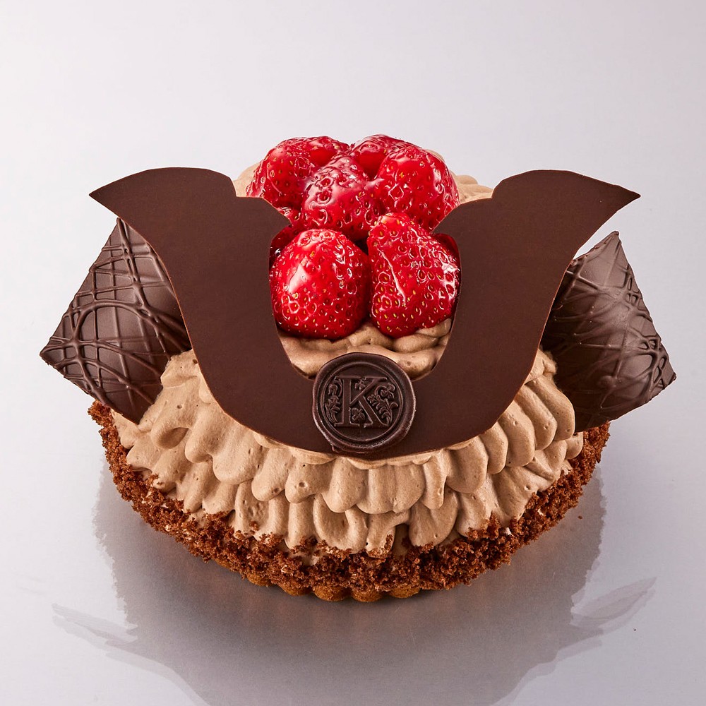 まるごとバナナを生クリームとカスタードクリームで包み、ココアスポンジでサンド。香ばしいタルト生地にのせて、生チョコクリームでデコレーションし、真っ赤ないちごとかぶと型のチョコレートで飾りました。