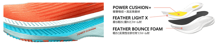 本シリーズ最大の特徴は、ソール内部に搭載した弊社独自の衝撃吸収反発素材「パワークッション®プラス」です。高いクッション性が走行時の衝撃を和らげ、ひざへの負担を軽減するとともに、優れた反発性で弾むような走行感を実現します。