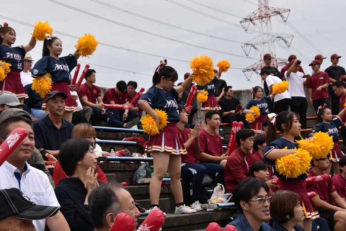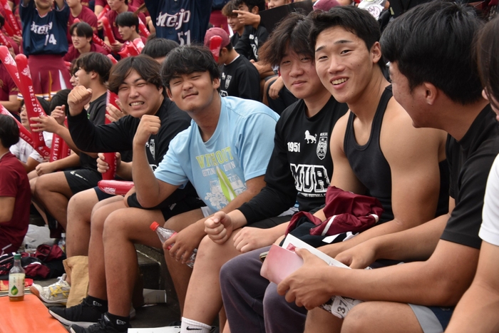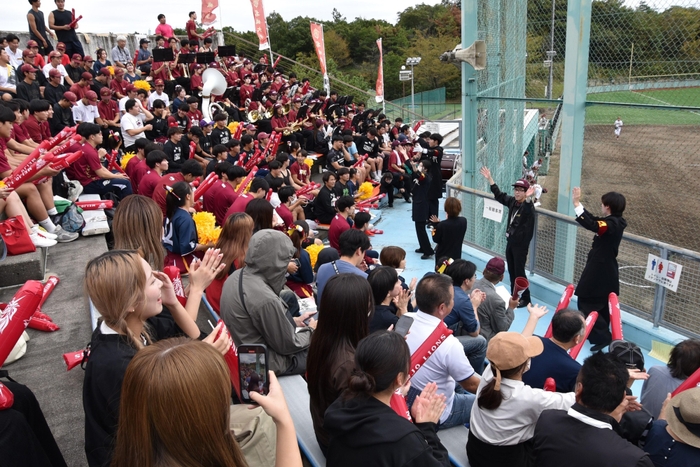 この日は天白キャンパスから無料バスが総合グラウンドまで運行され、さらにハンドボール部やラグビー部の部員たちも加わり、名城側スタンドは満席に。チャンスのたびに應援團リーダー部とチアリーディング部、吹奏楽部のパフォーマンスとともに熱烈な応援が繰り広げられ、選手たちを後押ししました。