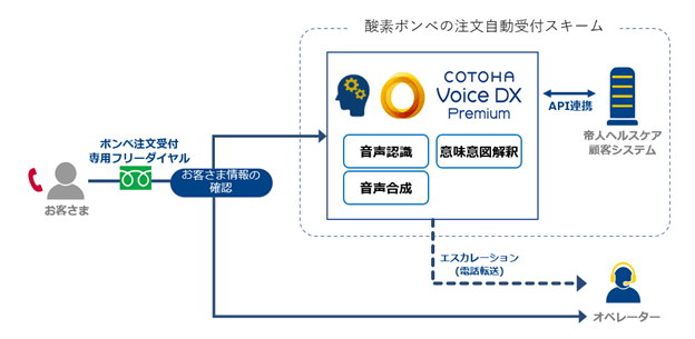 (4)両社は、このような課題を解決し、患者さんの利便性をさらに向上させるため、NTT Comの「COTOHA Voice DX(R) Premium」を活用したAIによる受注対応の仕組みを開発し、2021年9月から「酸素ボンベの注文受付自動化」の実証実験を実施してきました。