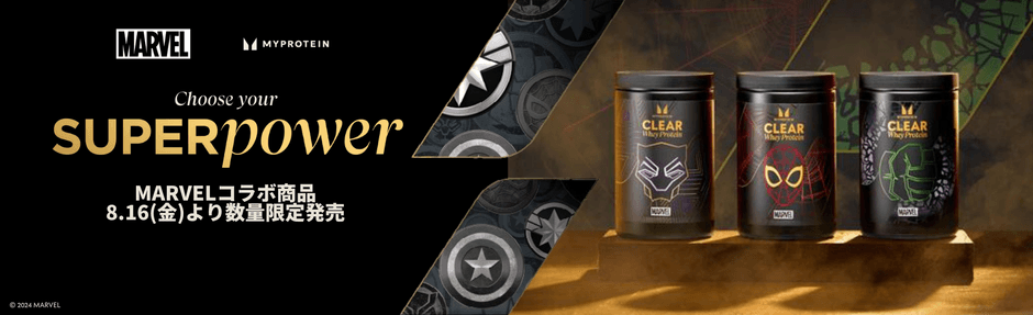 マイプロテインの人気商品「クリアホエイプロテイン」からは、超人的な力と壁に張り付く能力を誇るスパイダーマンにインスパイアされた<ラズベリー&ストロベリーフレーバー>、驚異的な筋力と耐久力を持つハルクにインスパイアされた<ウメ&キウイフレーバー>、そして俊敏性を兼ね備え世界平和のために戦うブラックパンサーにインスパイアされた<ブルーラズベリーフレーバー>が誕生しました。この他にもスクープや、3人のスーパーヒーローの絵柄を施した、耐久性に優れたメタルシェイカーも登場。今回発売する「Marvel コラボ詰め合わせBOX」はこれらを一度にお試しいただける豪華な内容となっています。