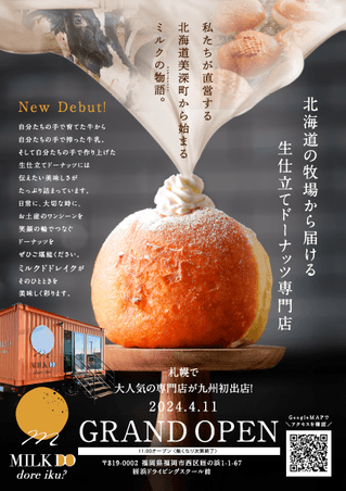 株式会社MILK DO dore iku(本社:〒064-0805 北海道札幌市中央区南5条西9丁目1016-23 SAビル、代表取締役:磯田 洋平)は、福岡県福岡市博多区千代に本社を置く都市ガス会社グループの持株会社、西部ガスホールディングス株式会社(本社:〒812-0044 福岡市博多区千代1丁目17番1号、代表者名:加藤 卓二)と、この度フランチャイズ契約を締結し、4月11日(木)、『北海道生仕立てドーナッツ専門店 MILK DO dore iku?(以下 ミルクドドレイク) 姪浜店』を(〒819-0002 福岡県福岡市西区姪の浜1-1-67 姪浜ドライビングスクール敷地前)に九州初オープンします。食のコンサル集団「hanninmae」にプロデュースを委託し、「ミルクドドレイク」としては全国8店舗目(道内6店舗・道外2店舗)で6店目のフランチャイズ店となります。