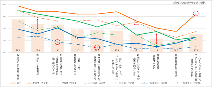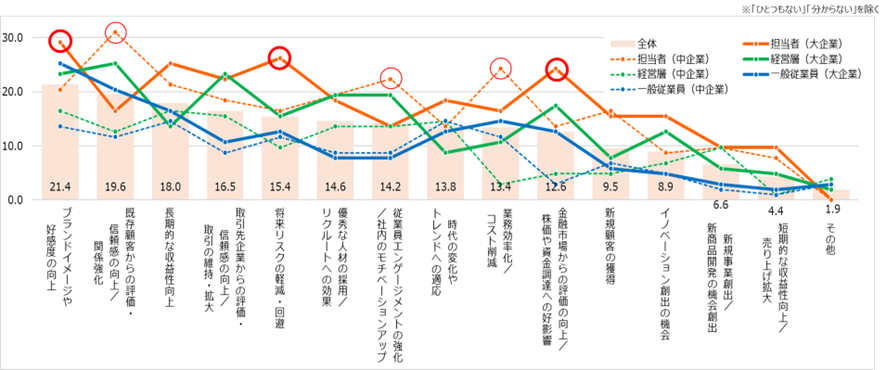 総じて、推進担当者は他よりも多くの効果・意義を認識しているが、大企業の担当者では「イメージや好感度」「リスクの軽減・回避」「金融市場からの評価」で特に高いのに対し中企業の担当者では「既存顧客との関係強化」「従業員エンゲージメント」「業務効率化」で高くなっており特徴的。