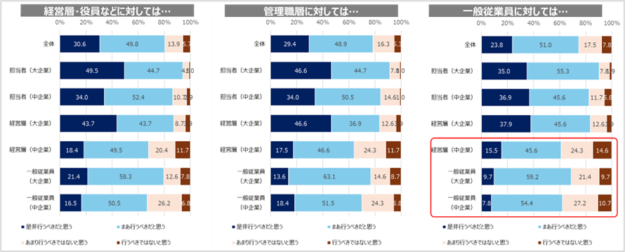 「経営層」「管理職」「一般従業員」のいずれに対しても、概ね8割が「行うべきだと思う(是非+まあ)」と回答。