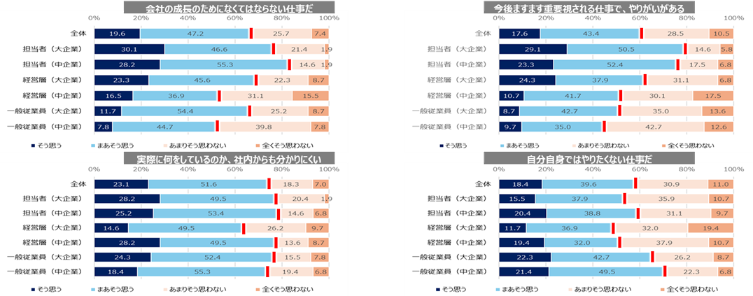 「会社の成長にとっての必要性」や「今後ますます重要視される仕事」であるかどうかは、担当者と他において、特に中企業での意識差が大きく、組織内での理解があまり得られていない状況が懸念される。また、「何をしているのか社内からわかりにくい」では担当者でも約8割、さらに「自分ではやりたくない仕事だ」では、担当者を含めすべての立場でほぼ過半数が同意(そう思う+まあそう思う)している点は今後の取り組みにおける一つの課題とも言える。