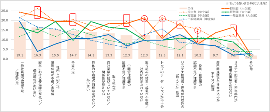 担当者では「経営での優先順位」「予算不足」「中間管理職の認識不足」に加え、「サステナ担当者が現場の事情を知らない」といった項目で企業規模を問わず共通して高いが、「成果が不明瞭」「トップのリーダーシップ」「経営層の認識不足」では、企業規模による意識差があり、傾向として中企業担当者での経営層への不満がうかがえる。