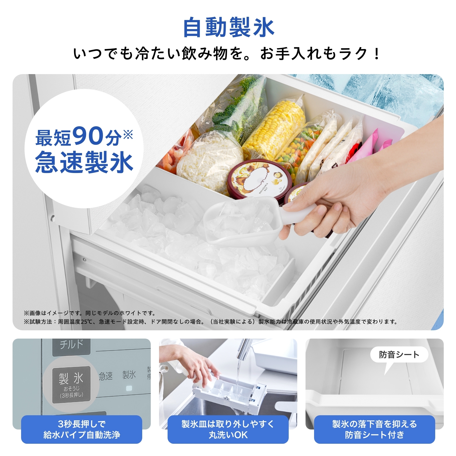タンクに水を入れてセットするだけで氷がつくれる自動製氷。最短約90分の急速冷凍も可能で、急な来客時や急いでいるときなどに活躍します。製氷ボタンを3秒長押しするだけで給水パイプを水洗いします。製氷皿は取り外して丸洗いできるからいつも衛生的です。さらに製氷時の氷の落下音を防音シートで抑えることができます。