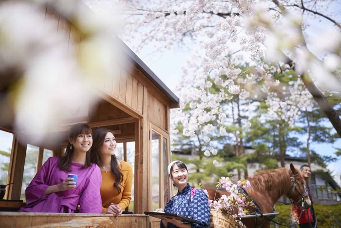 青森の文化を満喫できる宿「星野リゾート 青森屋」では、桜が見頃の2021年4月20日から5月9日まで、こたつで温まりながら花見酒を楽しめる「花見こたつ」を実施します。肌寒い青森の春、快適に花見ができるように桜の木の下にこたつを設置し、青森県内各地の10種類の地酒をふるまいます。こたつに入り、桜を間近で見ながら花見酒を楽しめます。