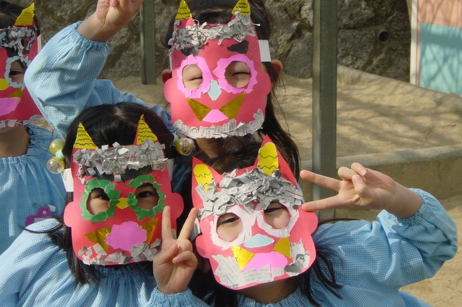 2月3日の節分当日は、園の前一帯が交通規制となり、参拝客や露店で街がにぎわう中、園児たちもお祭りの雰囲気を感じながら登園します。自分たちで作ったお面を身につけ、「鬼は外、福は内」という元気な掛け声とともに、豆をまきます。「無病息災」を願うこの行事は、地域の営みの一部として季節の節目を体感する大切な機会となっています。