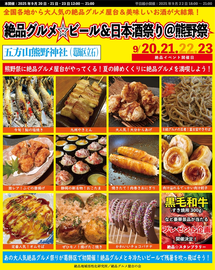 絶品グルメ屋台の会(所在地:埼玉県さいたま市)は、五方山熊野神社の熊野祭とコラボし、東京都葛飾区立石に鎮座する「五方山熊野神社」境内にて、2025年9月20日(土)~23日(火・祝)の4日間、“庶民派食フェス”『絶品グルメ☆ビール&日本酒祭り@熊野祭2025』を開催いたします。